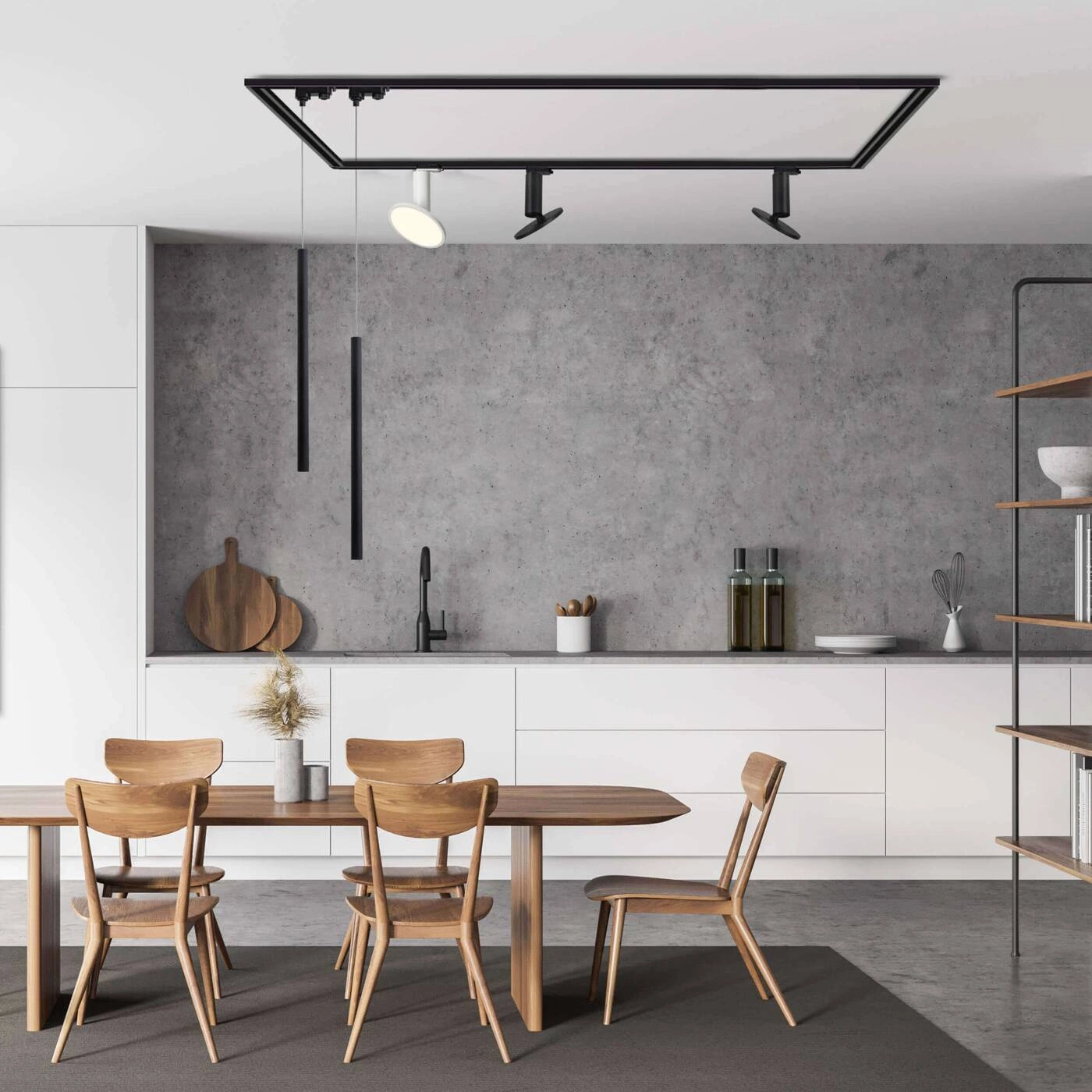 Zestaw oświetlenia szynowego Aqualion 1F w białym kolorze z trzema reflektorami to kompletny zestaw zawierający szynę oświetleniową o długości 150 cm, trzy reflektory do montażu na szynie oraz zasilacz końcowy i zaślepkę.