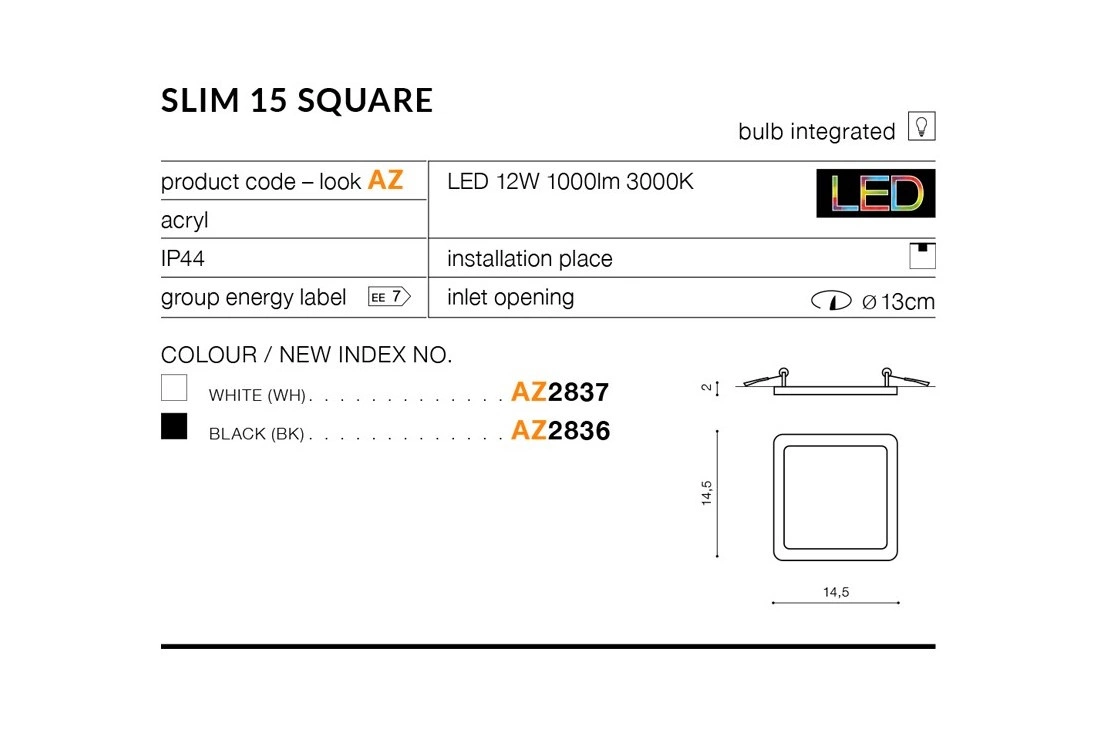 Azzardo SLIM 15 SQUARE 4000K IP44 WHITE 4378