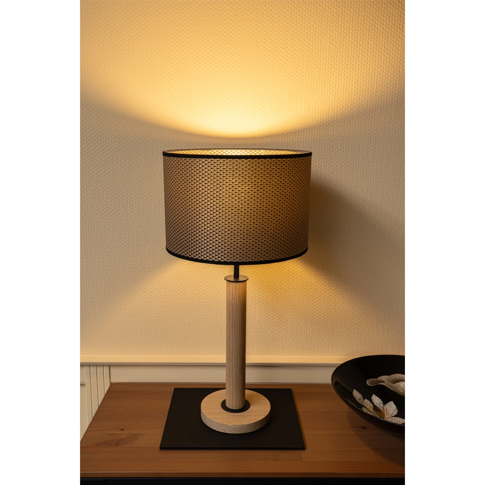 Lampa stołowa Benita Czarna to połączenie klasycznego piękna naturalnego drewna z nowoczesną elegancją. Olejowana dębowa podstawa wnosi do wnętrza ciepło, a klosz w odcieniach brązu, czerni i złota dodaje stylowego akcentu. Całość dopełnia kabel w czarnym oplocie, który nadaje lampie wyrazisty charakter. Dzięki maksymalnej mocy 40W lampa ta doskonale sprawdzi się jako dodatkowe oświetlenie w salonie, sypialni czy na biurku, tworząc przytulną atmosferę i dodając wnętrzu niepowtarzalnego stylu.
