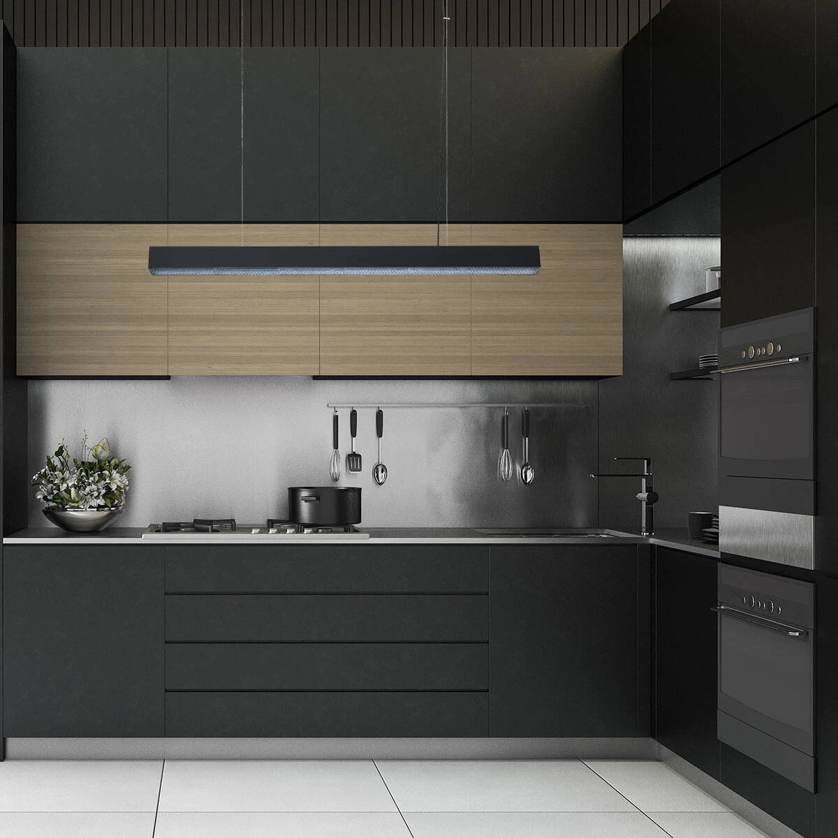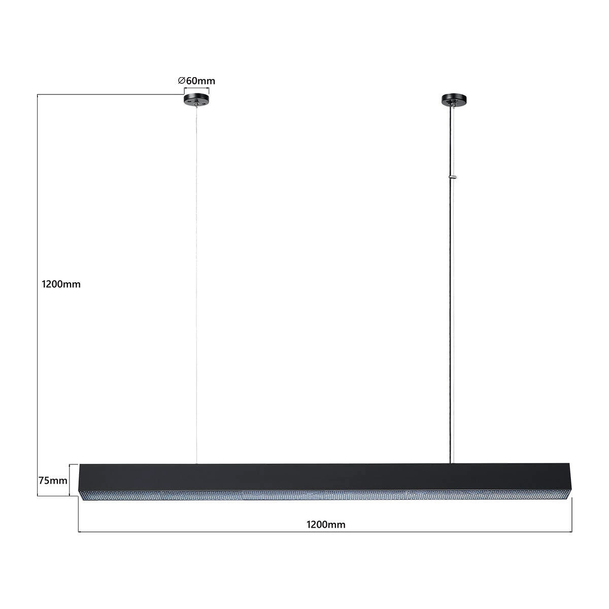 Lampa  łączy w sobie nowoczesny design i zaawansowaną technologię. Lampa wykonana jest z trwałego aluminium w czarnym kolorze, co nadaje jej nowoczesny i elegancki wygląd. Kształt podłużnego prostopadłościanu oraz unikalna blenda o wzorze plastrów miodu sprawiają, że lampa stanowi nie tylko źródło światła, ale również interesujący element dekoracyjny. Lampa zawieszana jest na regulowanych linkach, których maksymalna długość wynosi 120 cm, umożliwiając dostosowanie wysokości do indywidualnych potrzeb. Zaawansowana technologia LED CCT pozwala na regulację barwy światła, dzięki czemu można dopasować oświetlenie do każdej sytuacji i nastroju. Lampa oferuje możliwość sterowania za pomocą aplikacji Tuya Smart, co umożliwia łatwe i wygodne zarządzanie oświetleniem z dowolnego miejsca w domu. Ta lampa to idealne rozwiązanie dla osób ceniących nowoczesne technologie i prosty design. Lampa wisząca Mira L w szczegółach Rodzaj lampy: Czarna lampa wisząca w rozmiarze L z kolekcji Mira. Wymiary: Lampa posiada wysokość 120 cm (do regulacji) i szerokość 120 cm. Materiał i kolorystyka: Lampa została wykonana z aluminium w czarnym kolorze. Źródło światła: Lampa posiada wbudowane źródło światła LED CCT o zmiennej barwie.