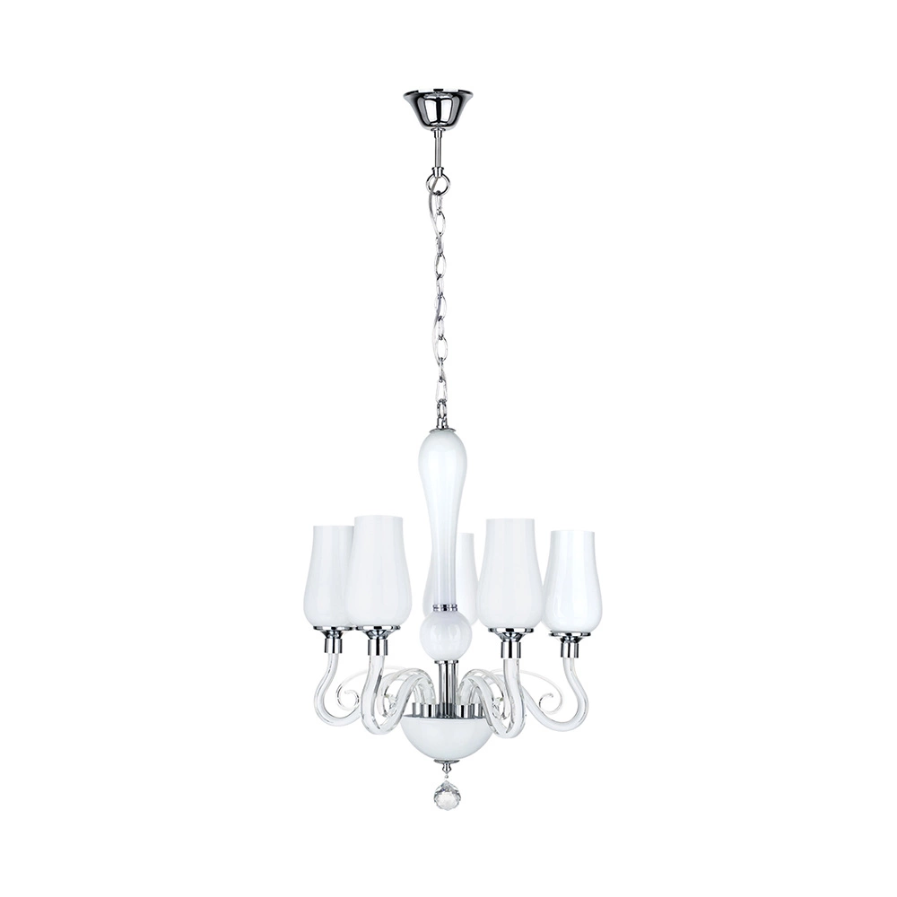 Elegancki i nowoczesny, żyrandol Lutecja z pięcioma źródłami światła E14 idealnie nadaje się do średnich i dużych przestrzeni, Biały metalowy stelaż, chromowane detale i transparentne kryształy tworzą luksusowy wygląd, który dodaje elegancji każdemu pomieszczeniu, Pięć źródeł światła o maksymalnej mocy 40W zapewnia intensywne i równomierne oświetlenie, które subtelnie rozprasza się przez kryształy, tworząc efektowne refleksy i przyjemną atmosferę,