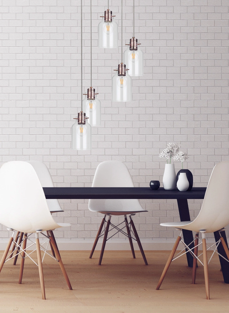 Wyraź swoje zdanie dzięki lampie wiszącej Alessandro, zaprojektowanej do oświetlania większych powierzchni dzięki pięciu oprawkom E27. Cylindryczny przezroczysty szklany klosz, zawieszony na efektownej miedzianej metalowej oprawie, zapewnia elegancki i nowoczesny wygląd. Przezroczysty kabel PVC i unikalne mocowanie z metalowym kołkiem podnoszą konstrukcję lampy, dodając jej odrobinę wyrafinowania. Niezależnie od tego, czy chodzi o wielką jadalnię, przestronny salon, czy stylowe wejście, Alessandro łączy w sobie elegancję i funkcjonalność, aby upiększyć każdą przestrzeń.