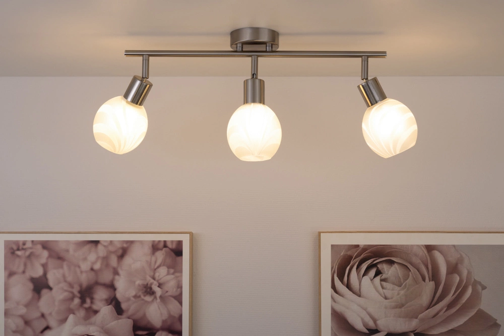 Lampa sufitowa Sara oferuje wyrafinowane rozwiązanie oświetleniowe dzięki trzem oprawkom E14 i eleganckiej, satynowej metalowej konstrukcji. Białe szklane klosze zwiększają zdolność lampy do równomiernego rozpraszania światła, dzięki czemu idealnie nadaje się do salonów, jadalni lub sypialni.