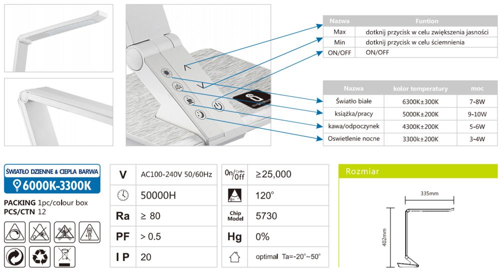 Zakres regulacji barwy światła 3300K - 6000K (ciepła - zimna)