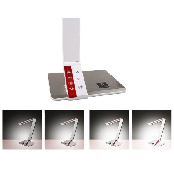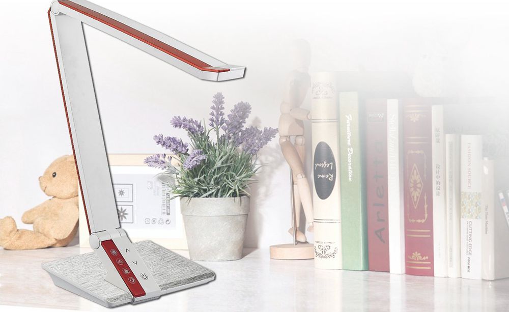 Lampa kreślarska posiada elastyczną konstrukcję i prosty design. Kolor biały z czerwonymi wstawkami.