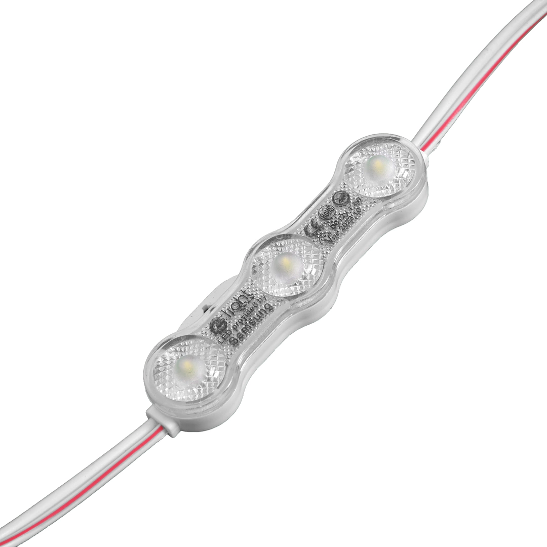 CECHY PRODUKTU: • Moduł EKO-SSPRO3 to wysokiej jakości moduł 3-diodowy wyposażony w diody SMD2835 marki SAMSUNG o unikatowej mikropryzmatycznej soczewce, gwarantującej wyjątkowe parametry świetlne (jednolitą emisję światła, niepowtarzalny efekt rozpraszania światła, brak punktów świetlnych – recesja światła), 170 kąt świecenia • Moduł EKO-SSPRO3 posiada miedzianą instalację (II klasa grubości) i jest wyposażony w taśmę 3M usprawniającą proces montażu • Moduł EKO-SSPRO3 jest rekomendowany do kasetonów, tablic reklamowych i liter blokowych o głębokości 80-200 mm. • Moduł EKO-SSPRO3 jest produkowany w unikalnej technologii formowania wtryskowego tworzywa sztucznego do zewnętrznej osłony, co zapewnia lepszy efekt chłodzenia UL 94V0 ABS. • Moduł EKO-SSPRO3 niskiego napięcia wejściowego 12V DC, posiadający wodoodporność klasy IP68 (PEŁNA WODOODPORNOŚĆ) i 5 letnią gwarancję fabryczną.