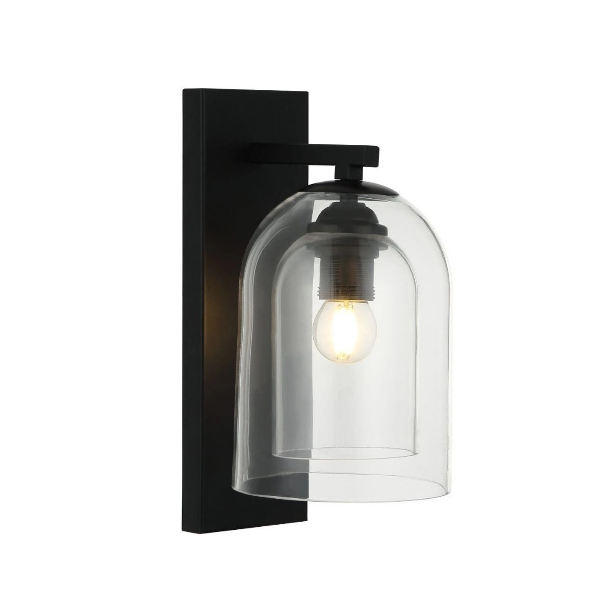 Kinkiet z kolekcji Elaris, wykonany ze szkła oraz metalu. Przeznaczony na żarówkę o gwincie E27. Podstawa kinkietu jest w kolorze czarnym.